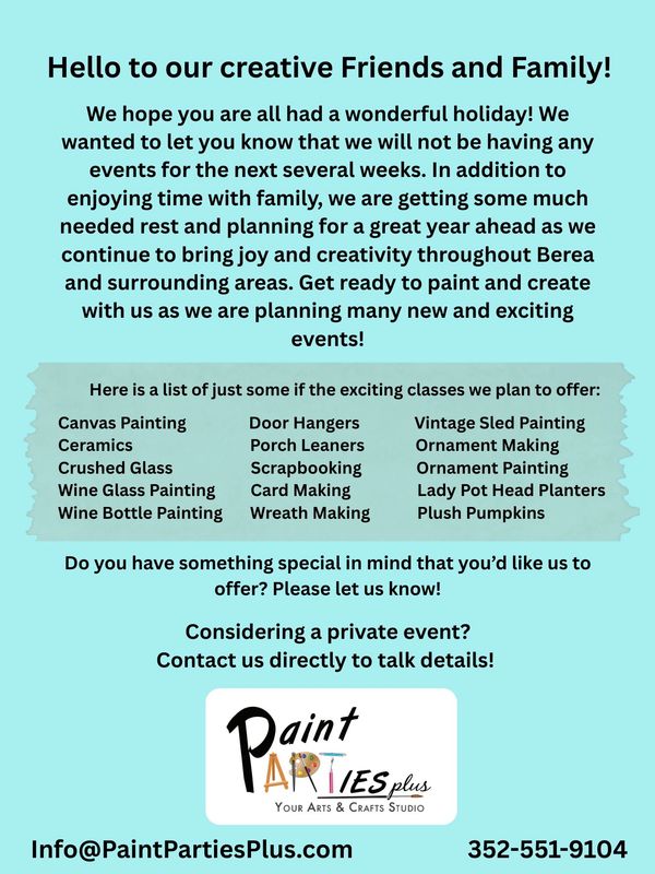 We're mixing it up with a variety of classes this year! Our goal is to offer something for everyone! Let us know if there is a specific class you would like us to offer.